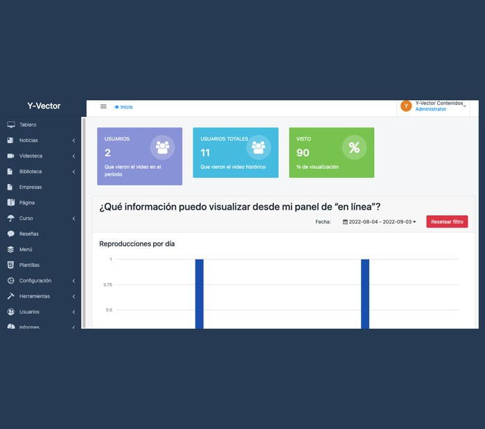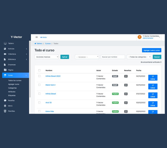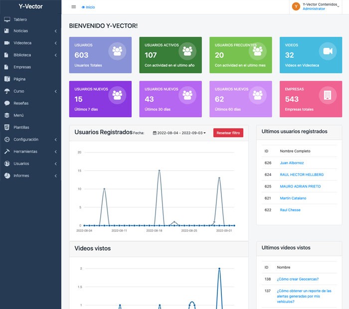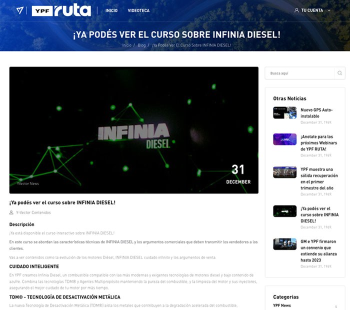 Acompañamos a YPF en un proceso de migración de su sistema de repositorio de cursos online a una infraestructura más moderna en AWS, que los ayudara a soportar altos niveles de tráfico, y dejar de sufrir caídas en la arquitectura que tenían hasta ese momento. Una vez logrado ese primer objetivo, comenzamos a desarrollar una plataforma propia de cursos online y videoteca de referencia para sus servicios y clientes internos que llamamos Y-Vector. Los clientes internos de YPF como YPF Ruta, YPF Agro, YPF Gas, etc. utilizan esta completa plataforma para brindar soluciones de e-learning entre sus empleados y proveedores. La plataforma cuenta con un completo sistema de autoadministración que permite gestionar todo el contenido del sitio. Permite modificar todos los textos del sitio, incluyendo sliders, así como actualizar colores, logos, imagenes, etc. Los administradores pueden disponer de los elementos que se ven en pantalla, cambiar el orden de los módulos, etc. Esto le permite a los administradores tener completo control de todo el sitio sin necesidad de intervención técnica avanzada.